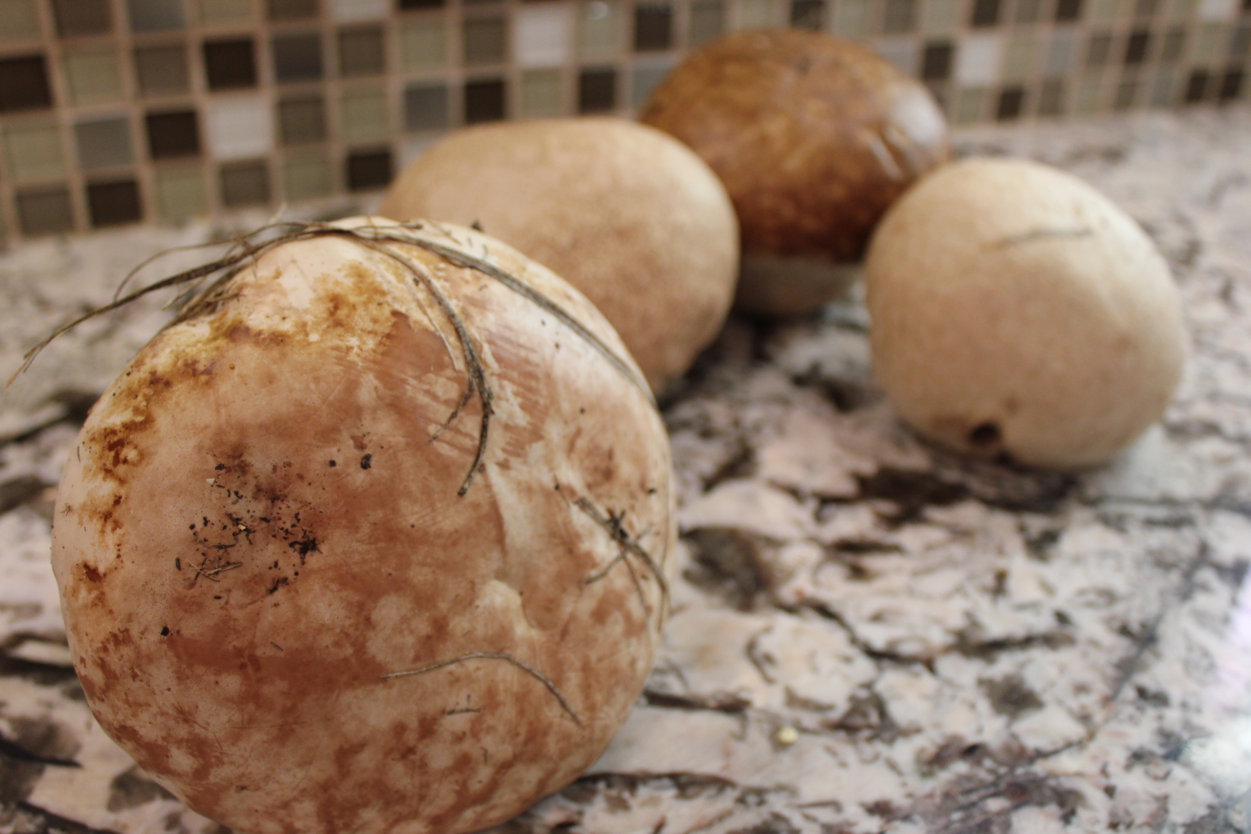 A few weeks ago Dad and I were working at the Airport when something shiny in the field caught my eye…… it was a Puffball Mushroom! Like a kid on an Easter egg hunt I tore through the field collecting mushrooms. Dad was just delighted (not really. He hates mushrooms)… I used him as an impromptu Easter egg basket. I filled Dad’s arms with with the lovely Puffballs while visions of Fried Mushrooms danced in my head.