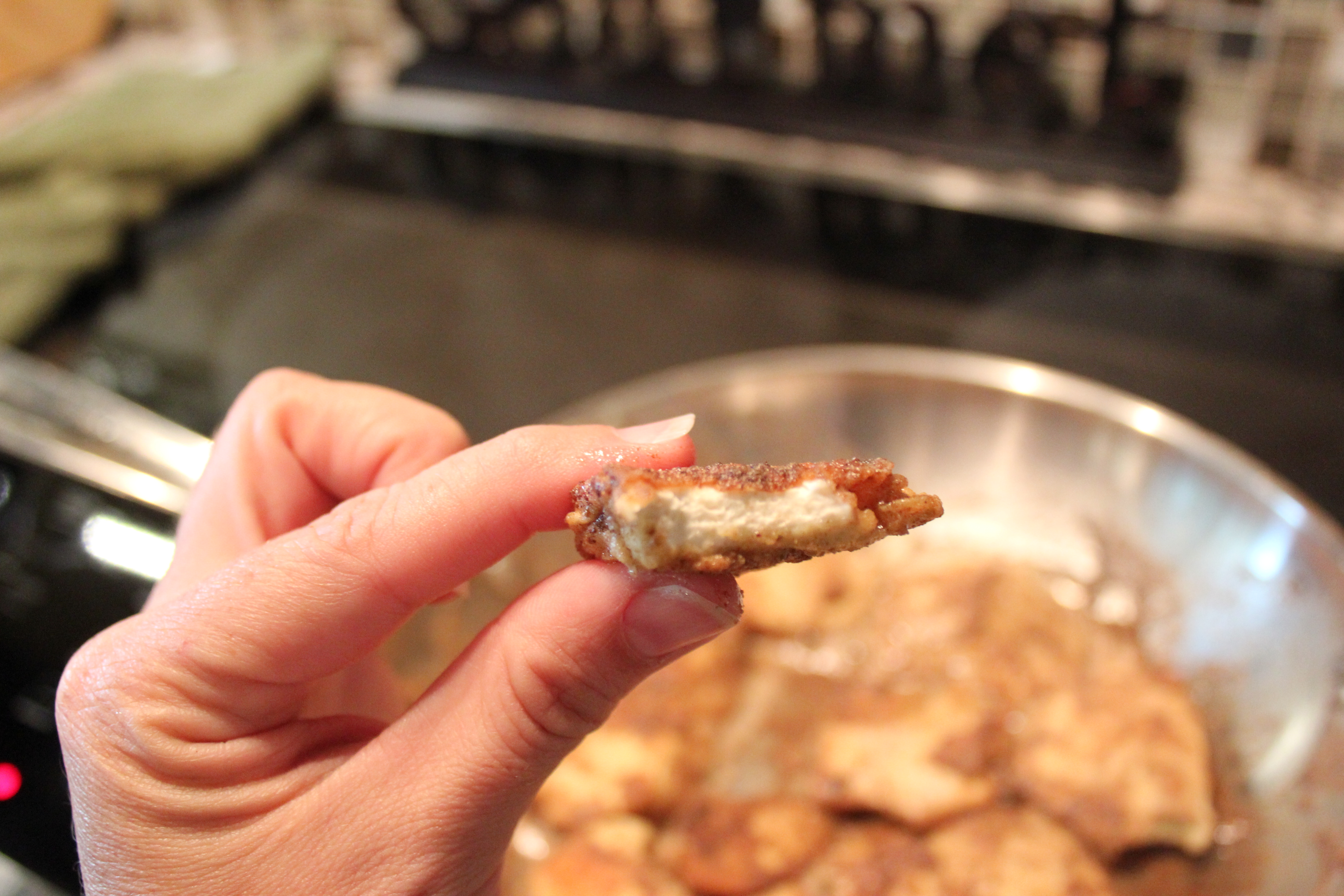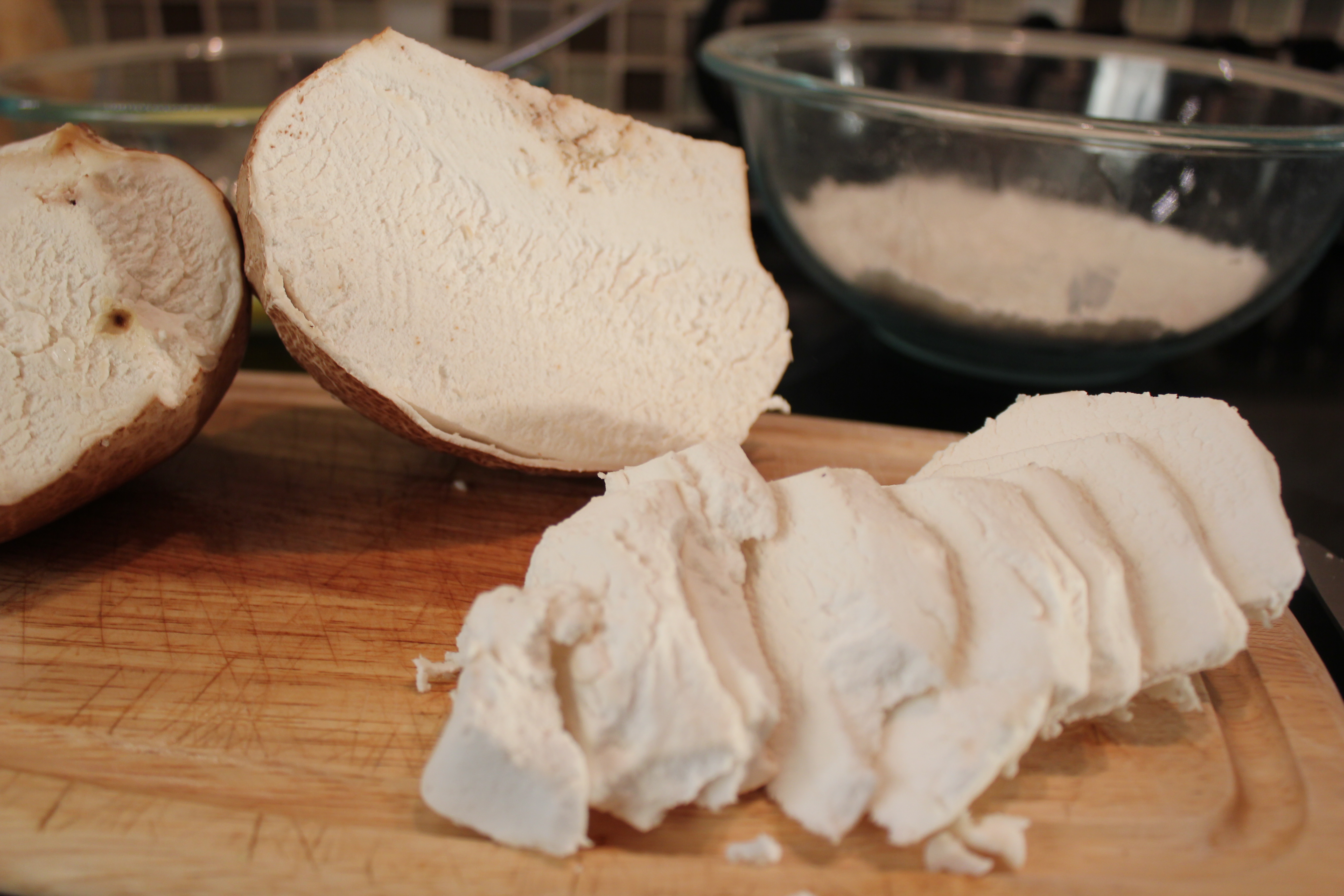 Wash and slice the puffball mushroom (make sure you a have a real puffball – http://www.mssf.org/cookbook/puffballs.html and that it is completely white inside). Dip the slices in the egg wash and then coat with the flour. Fry in the oil until toasty and brown. Eat and enjoy!