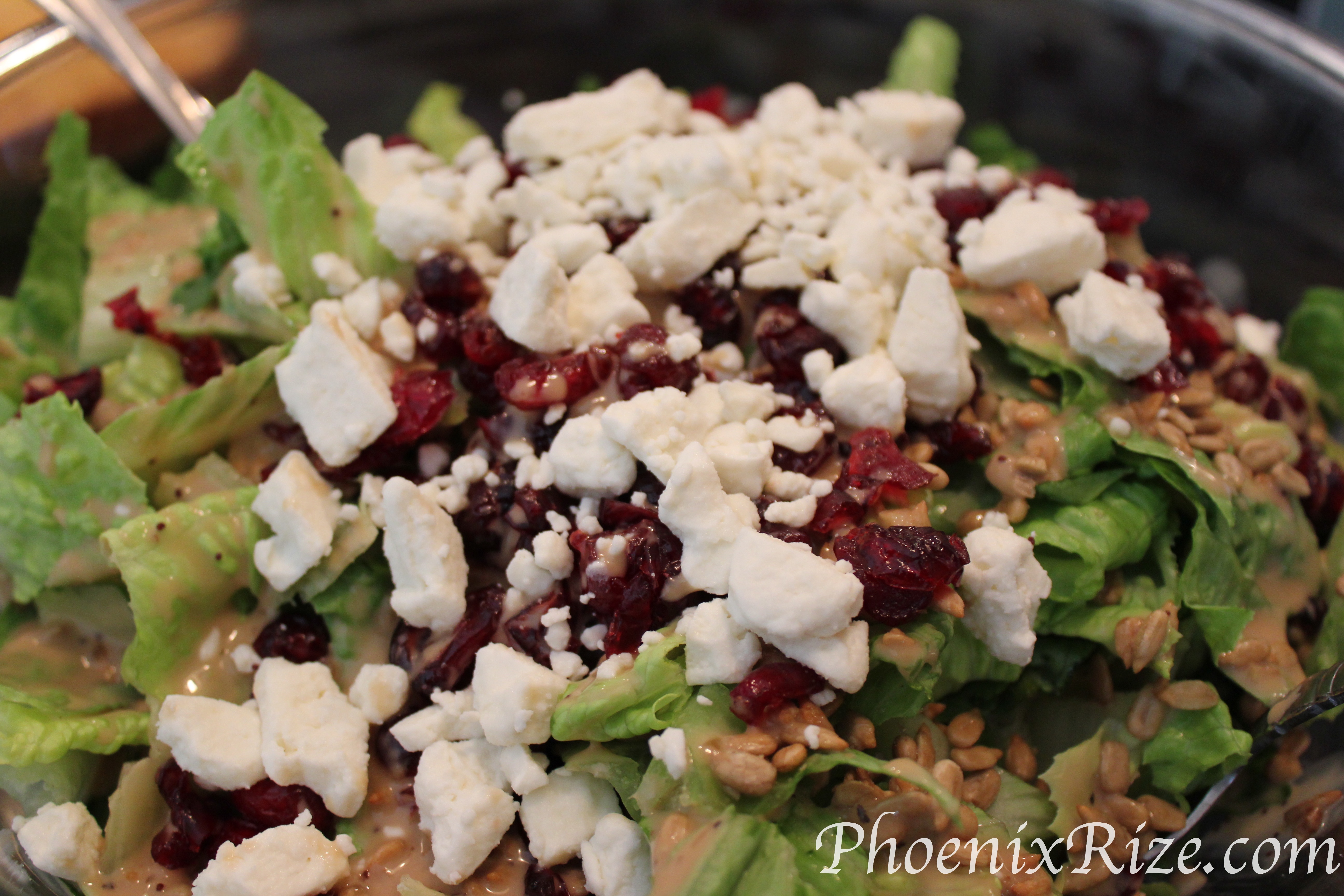 In a large bowl, combine the lettuce, apple, cranberries, pecans, and feta cheese.