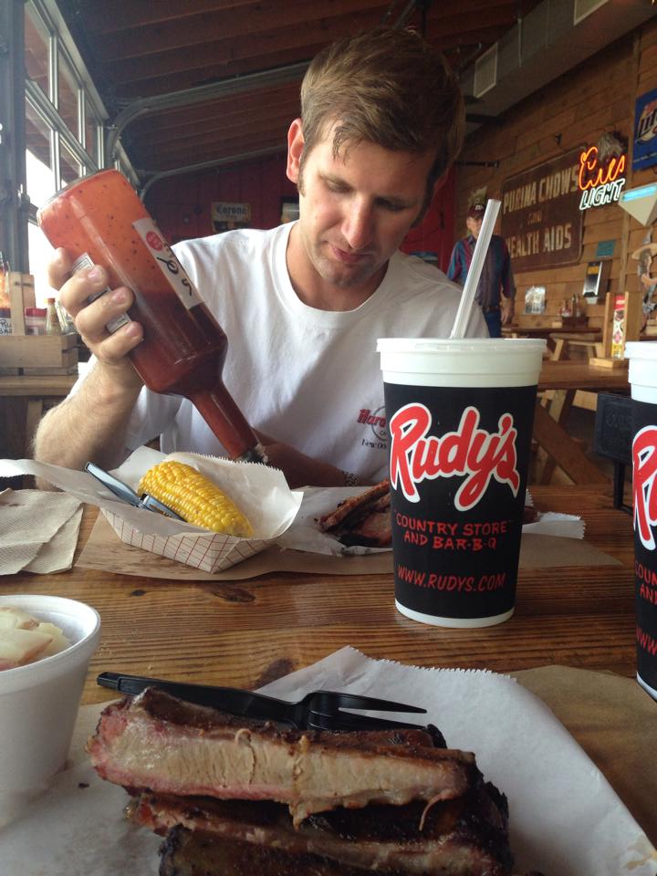 1/2lb of ribs. When it came to the sides I asked if the cream corn had any flour in it and mentioned that I was allergic to wheat (It’s easier to say “allergic” than to explain “gluten-sensitive”…. people get “allergic” and the outcome is the same for me… no wheat.) He got it right away and warned me about all the other side options with wheat. So I ended up with new potatoes…. yum and Brian got the corn on the cob. Even the signature BBQ sauces were labeled Gluten-Free. Brian and I loved our dinners and really appreciated how friendly and knowledgeable the staff were. If you ever are in the neighborhood, visit Rudy’s….. don’t let the gas station freak you out.