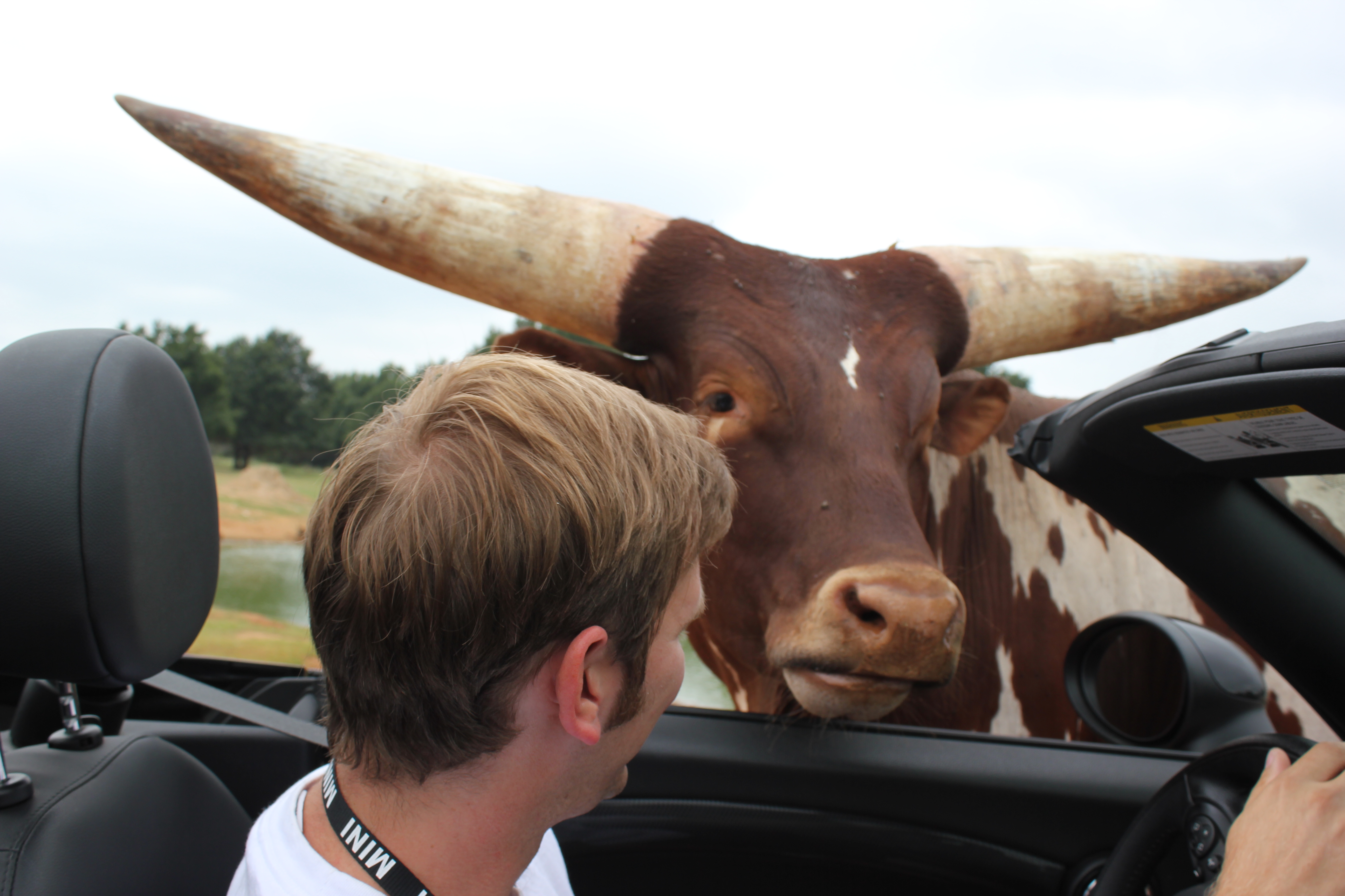 The trip through the Franklin Drive Thru Safari was more fun than I thought it would be. If it wasn’t for MINI, I would have never (a) found the place, or (b) bothered to go… Brian and I are pretty spoiled with our St Louis Zoo memberships… it takes a lot to compete. Probably what made it so much fun was sharing the experience with 400 other MINIs…. The Safari knew we were coming, but I don’t think the quite grasped how many of us there actually were…. Until you see 400-500 MINIs swarming down the highway, you just don’t get it. We shut down the main road into town… we blocked up everything for two miles…. the police finally came to direct traffic…. We weren’t being bad…. there were just a lot of us! The city police were very nice and they started directing people around us and soon everything got uncontested. We almost skipped the Safari because of all the traffic, but I’m really glad we decided to stay. (Not just for the cool hat..) We’re in the Roadster… with the top down…. so we had an excellent view of the animals… and they had an excellent view of us!