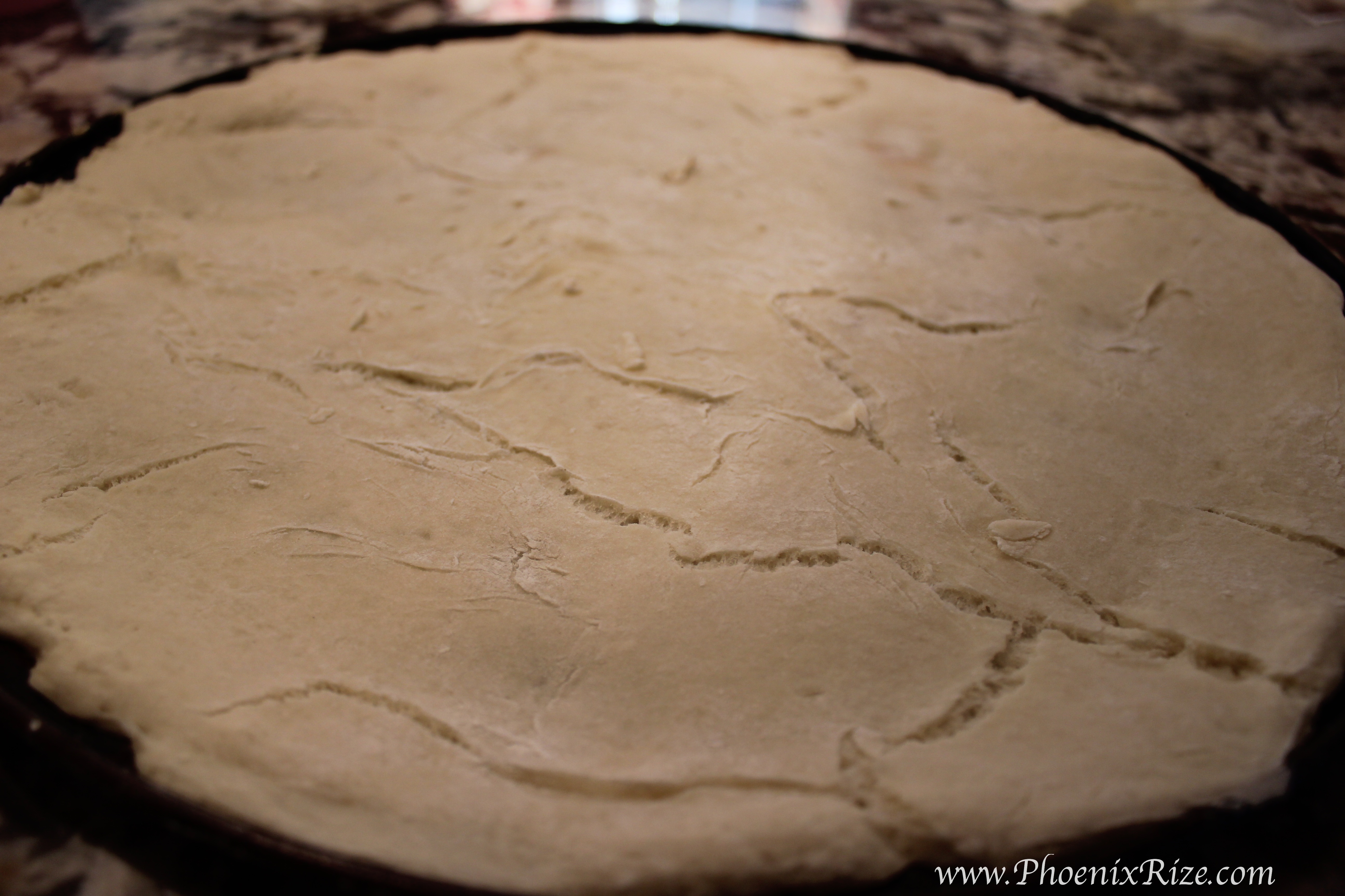 Lightly grease a pizza pan with olive oil. Place dough in the center of the pizza pan and using the side of your hand (see photos) gently press the dough to the edges of pan. Curst will be very thin, almost see-through. Bake pizza crust for 10 minutes.