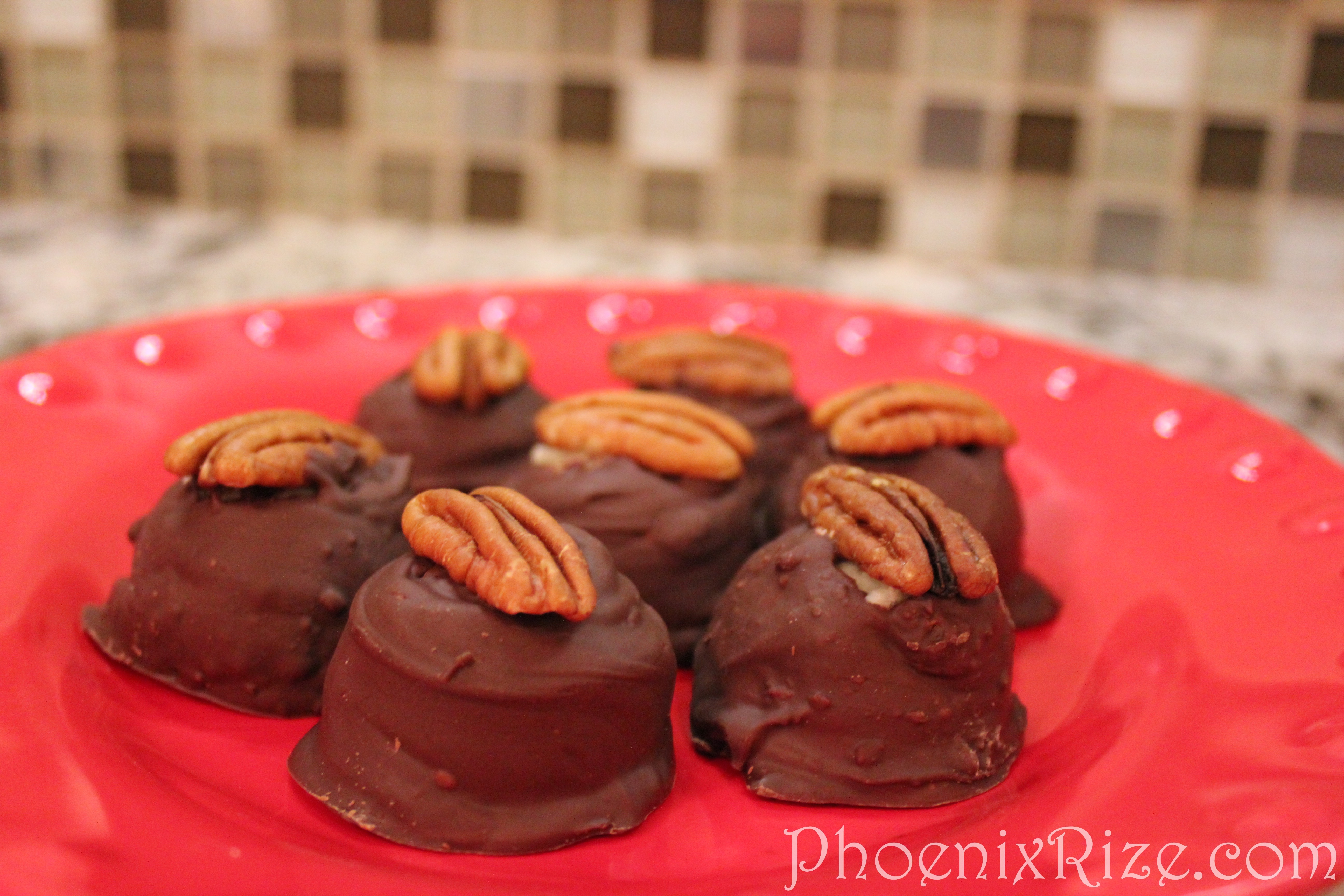 I used two fondu forks to dip the dough in the chocolate. I stabbed one into the top of the ball and dipped it into the chocolate…. then used the second fork to help lift the ball out of the chocolate and back onto parchment lined pan. I usually had a small spot on the very top without chocolate, but I just smooshed the pecan half down over the hole…. problem solved.