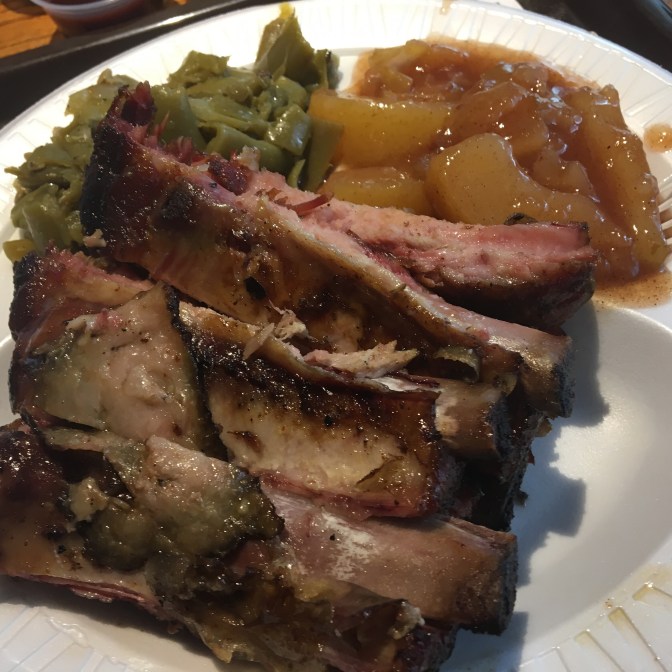 I didn’t ask about the meat being GF, the reviews said it was and usually BBQ is safe… And the guy behind the counter was wielding a big ass knife and I didn’t think he’d be super amused with me and my sissy system…. I DID ask the nice lady which sides would be safe and she told me to stay away from the mashed potatoes…. Really?! She said the green bean were safe… (And they were awesome! Green beans with BACON!) and the Cinnamon Apples. I was a bit suspicious about the apples…. Mashed potatoes have flour, but not the apples?! They looked really good. I ate one and I haven’t died yet… but we’ve got two more hours in the car today and I just didn’t want risk it anymore. Besides, I was stuffed! We could have totally shared a plate and still been stuffed silly.