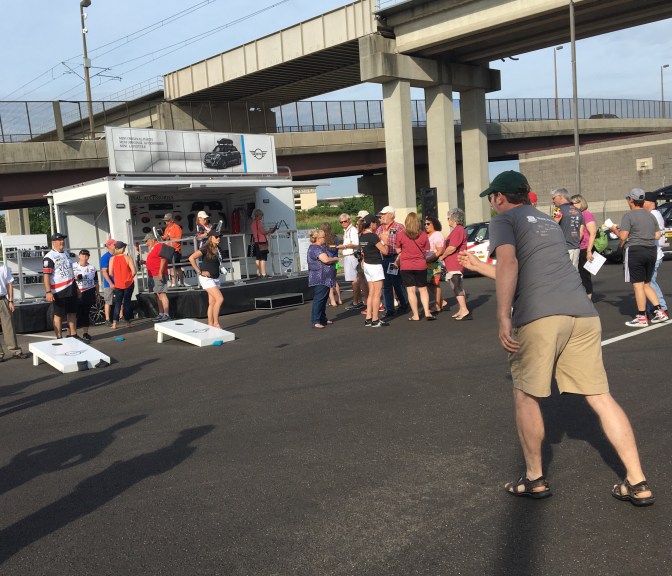 We wandered around until things got started and we were finally able to play the bean bag toss game. Get two bags in and you win a prize… We didn’t win. Then we hit the breakfast bar. I didn’t want a repeat of yesterday, so I’d eaten a good breakfast at the hotel already. The caterers MINI had in Baltimore were excellent. They had a great dinner the night before and a really nice breakfast this morning. The had a ton of staff keeping everything stocked and neat and they even had big dispensers of fruit infused water. They served Make Your Own Breakfast Burritos… Which was awesome for GF and non-GF people… Just skip the flour wrap if you’re gf. Really nice. I hope MINI has more set ups like this.