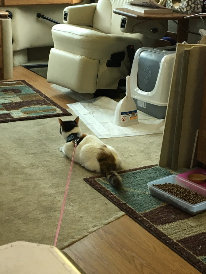 We hadn’t even made it to the highway when Brian started sniffing the air and looking around. ‘Do you smell that?’ Yeah… I smelled it. So I went searching for the source of the ‘kitty statement.’ Under the table I found Vickie looking traumatized. Someone had puked on Vickie’s head (I’m gonna give Vickie the benefit of the doubt here, cause it’s pretty hard to puke on your own head) and under the table… and pooped too… just for good measure. Vickie was looking at me like, ‘you know this wasn’t my fault, right?’