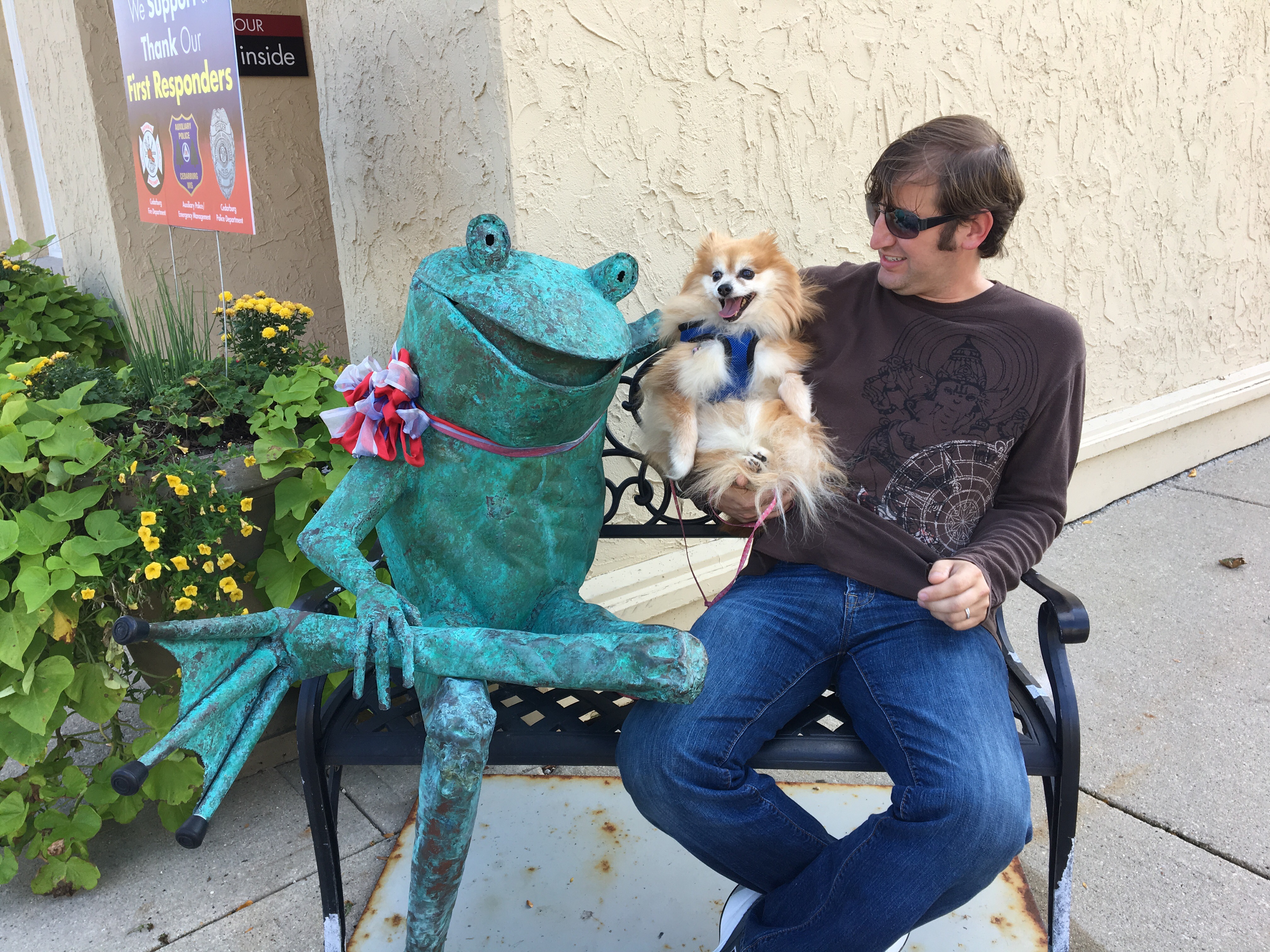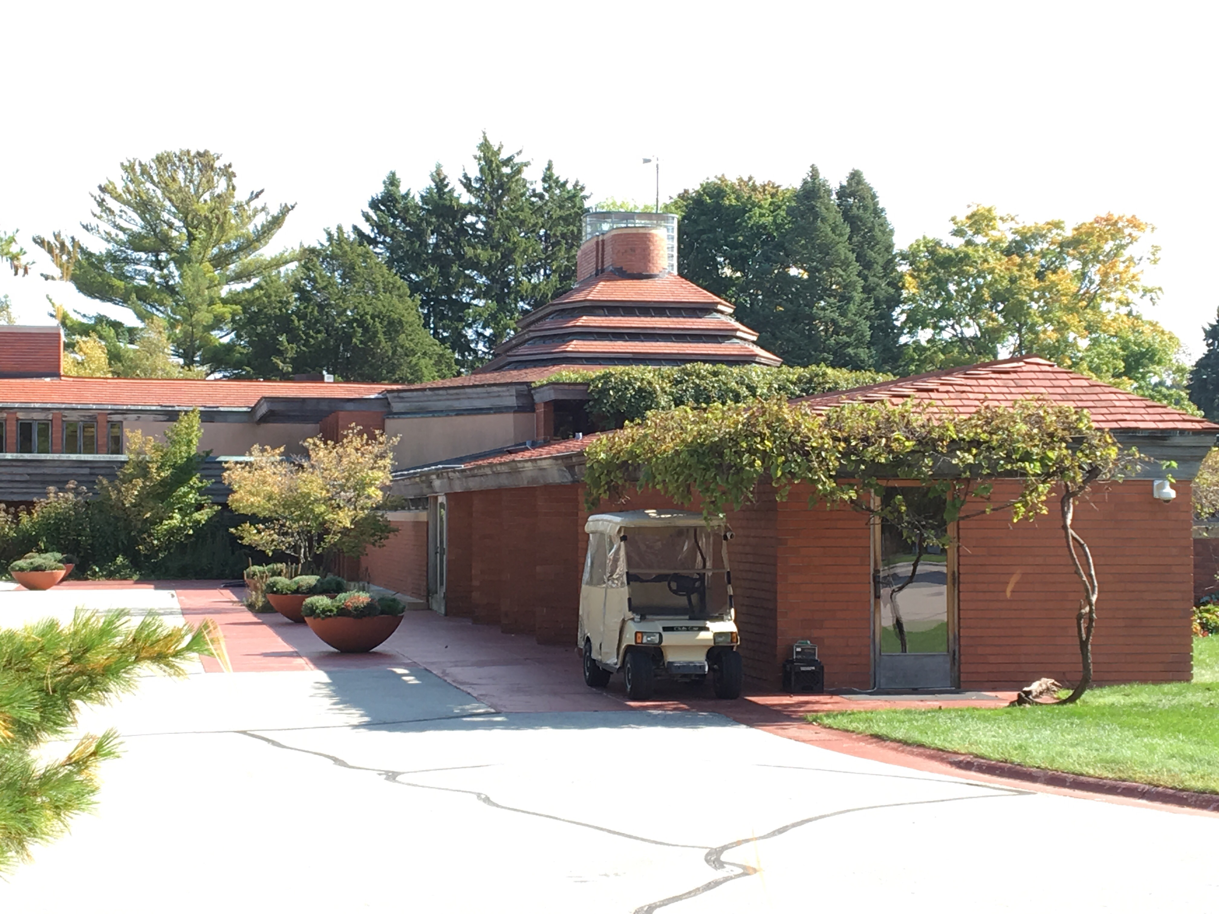 Brian, a fan of architecture, wanted to see some of the Frank Lloyd Wright houses today. I’m not a huge fan of FLW…. actually, I dislike FLW houses….. I think they’re uncomfortable, ugly and overly impressed with themselves… but Brian likes them.  I knew that Boo wasn’t welcome on any of the FLW tours so Mom and I agreed that one of us would go with Brian and one would stay in the car with Boo.  Since I was tired anyway, I said I’d be happy to stay in the car and Boo and I would read…. maybe take a walk around the grounds.  At Wingspread there was supposed to be a walkway out to a lighthouse or something…. it was on their map in the parking lot. Yeah… no… no walking on the grounds.  Gods forbid we walk around unchaperoned.  Boo and I got sent back to the front parking lot.  The lady, very politely, told us if we wanted to walk we could walk back up the driveway.  Oooookkaay.  Boo and I sat in the car and waited for Mom and Brian to return.  Boo and I remain unimpressed with Frank Lloyd Wright and his leaky houses.