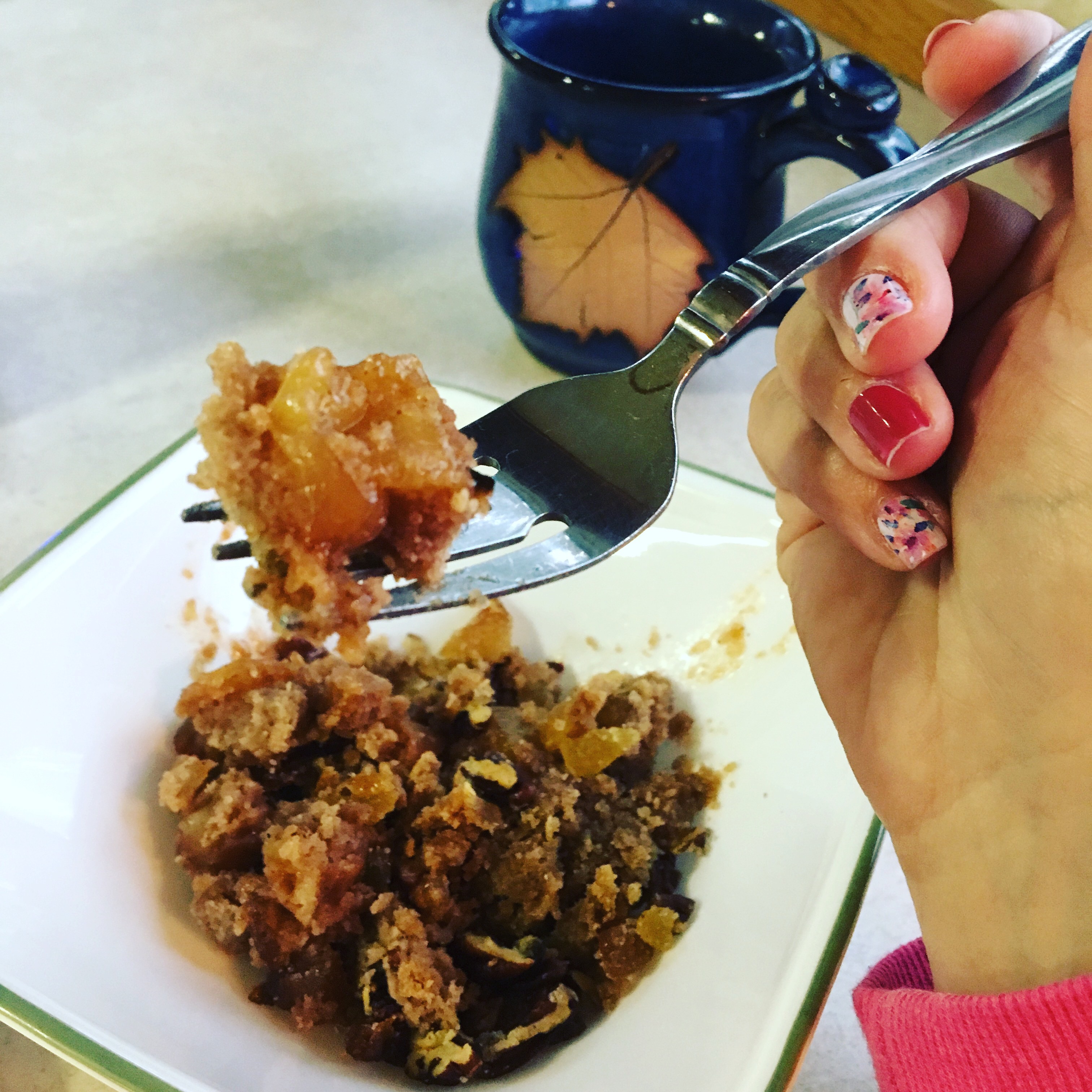 I took inspiration from one of my favorite bloggers, Sweet Recipea’s, Caramel Apple Cookie Cobbler. I adore Peabody, but her recipes are SO not gluten free…. mostly I just drool over her pictures, but I figured this recipe could be modified to GF fairly easily. I divided the recipe in half since I only have the mini oven to work with. And I also added crystalized ginger… because for some reason, Mom and I both had 2 jars (each)…. and pecans, ’cause, why not?