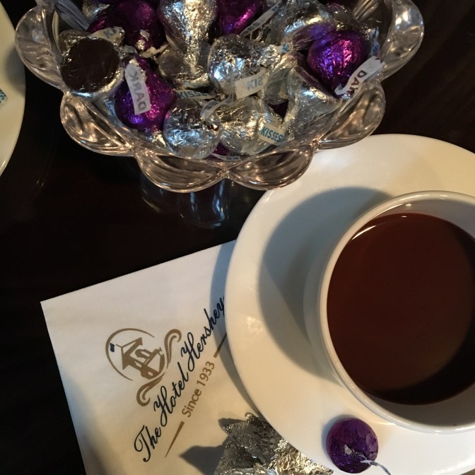 The room was beautiful. Rich, dark wood panels on the walls, coffered ceiling and a gorgeous fireplace dominating the far wall. Mom and I settled into the cozy leather chairs with a cup of hot chocolate (not hot cocoa… hot chocolate. Liquid chocolate. In a cup. Hot.) Bowls of purple and silver Hershey’s Kisses sat on tables around the room. Heaven.