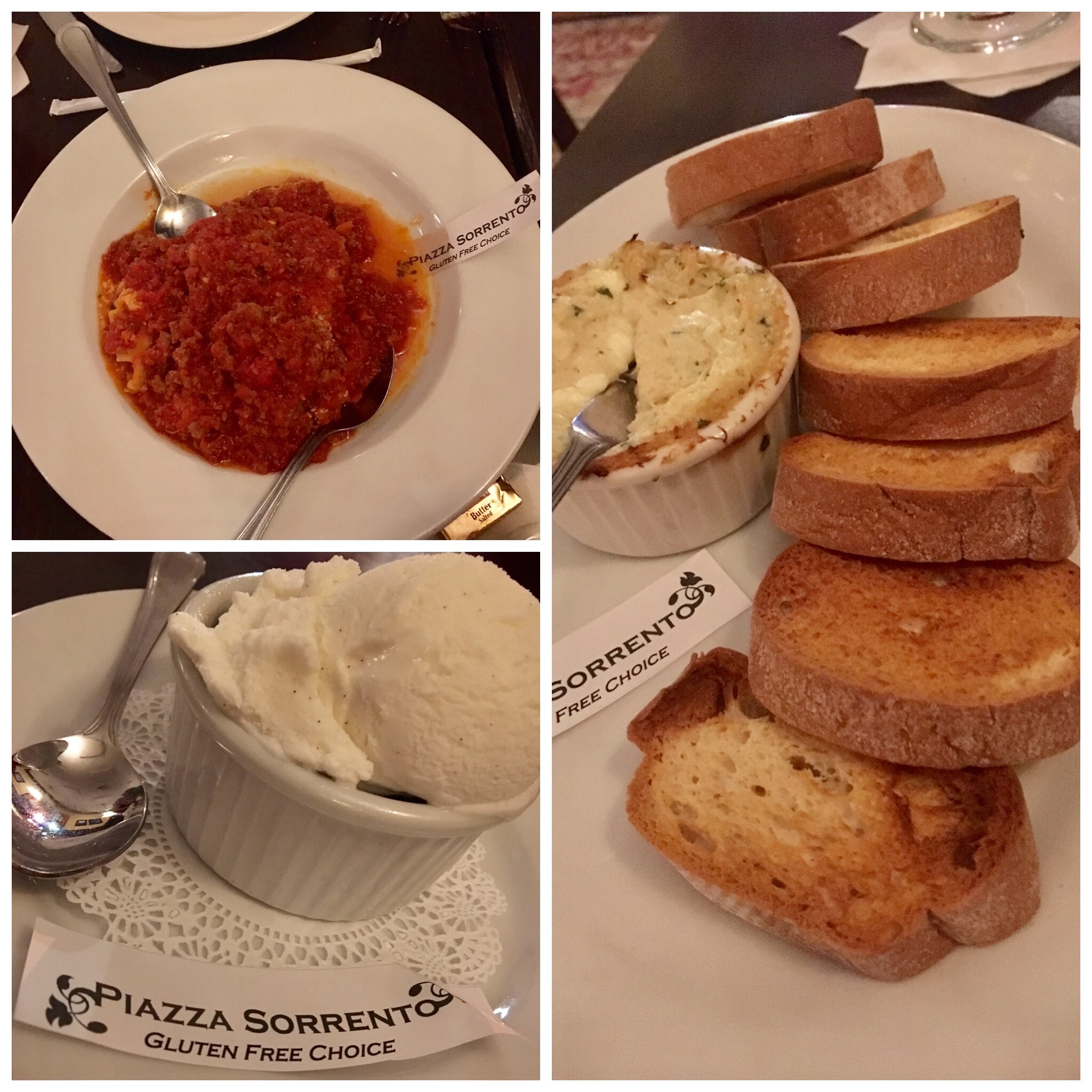Piazza Sorrento was absolutely fabulous! I asked for a gluten-free menu when we were seated and as soon a our waitress arrived she said ‘I see you have the GF menus, are there any other allergies or dietary concerns that I should be aware of?’ Wow! Usually you have to point that out 15 times… she asked us! (I heard her asking the other tables throughout the night if there were any dietary concerns… and I heard at least two other tables had GF people too.)