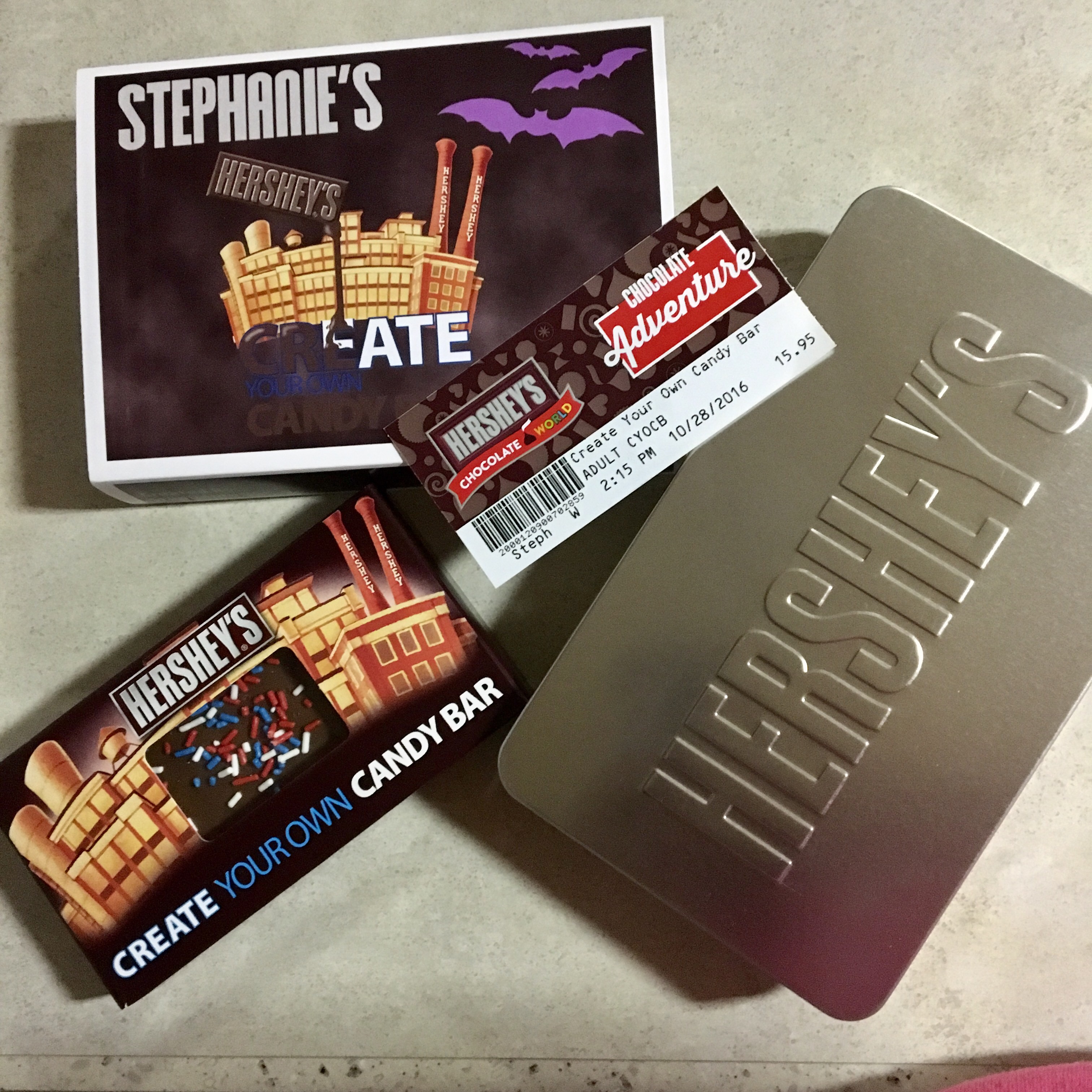 While the chocolate is cooling we personalized our wrappers on another set of computer screens… then we shuffled back out to watch the cooled chocolate bars ride another conveyer to the packaging area. Our tickets are scanned one last time before the nice Hershey’s people packed the bars into a tin box and then the personalized wrapper.