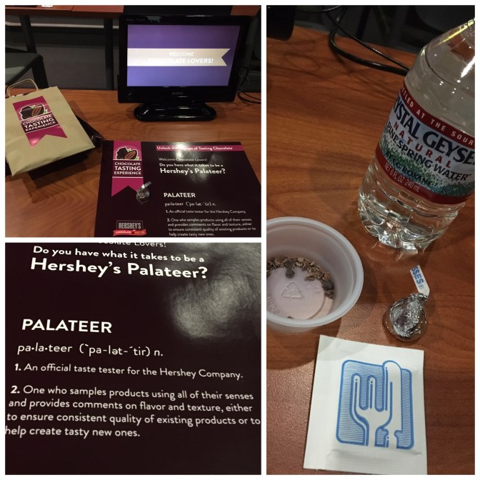 The Chocolate Tasting Experience was a huge disappointment. This is geared towards the adults… kids would be bored outta their skulls. I was expecting to get a variety of chocolates and somewhere I’d read about a hot chocolate tasting, but apparently this wasn’t it. We were each given a little gift bag (that they wasted their money on because most people threw it away as they left) with four small chocolate bars inside. On the table was a placemat that listed the different flavors/notes that we might taste in the chocolates, a bottle of water to cleanse our palates between bites of chocolate, a cup of ground cacao nibs, a Hershey’s Kiss and a Wet Wipe.