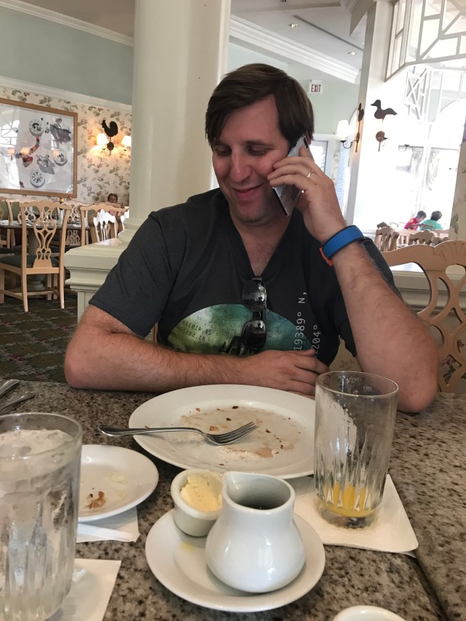 We also had breakfast at the Grand Floridian Cafe. I ordered the Allergy Friendly Mickey Waffles (of course) and Brian tried to order the Allergy Friendly pancakes, but the waitress misheard and brought him waffles too.