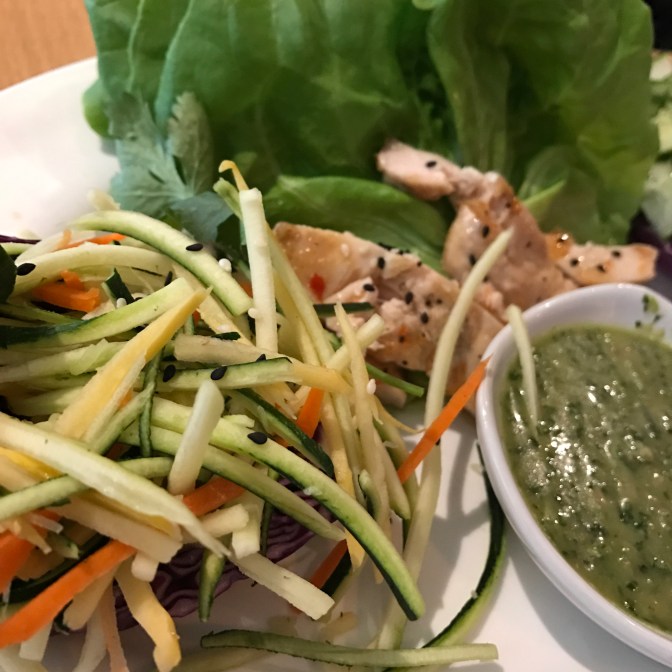 Thai Lettuce Wraps – Grilled Chicken, Julienne Vegetables, Bibb Lettuce, Cashew Sauce.