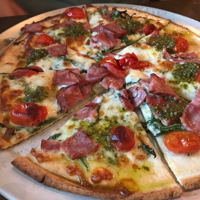 Our waitress brought me a sample of the blueberry cider from Slim Pickens Cider and Mead. (A local brewer!) I’m not normally a big cider drinker, but I couldn’t pass up blueberry. It had a nice berry flavor, but not overly sweet…. crisp. Perfect with pizza.