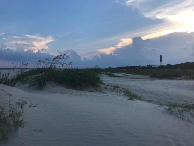 After dinner we walked a few blocks to the beach to burn off all the delicious pasta that we’d just narffed. The beach was beautiful with its white sand dunes and tufts of sea oats, but I’m relieved to say that I like my beach at home better. (Brian was super relieved too because he doesn’t want to have to move again for a while!) I’ll admit that I am jealous that they seem to have sand dollars. I’ve collected a lot of sea shells and other bits from our home beach, but I still haven’t found a whole sand dollar. I found pieces of sand dollar on the Charleston beach, but still not a whole one.