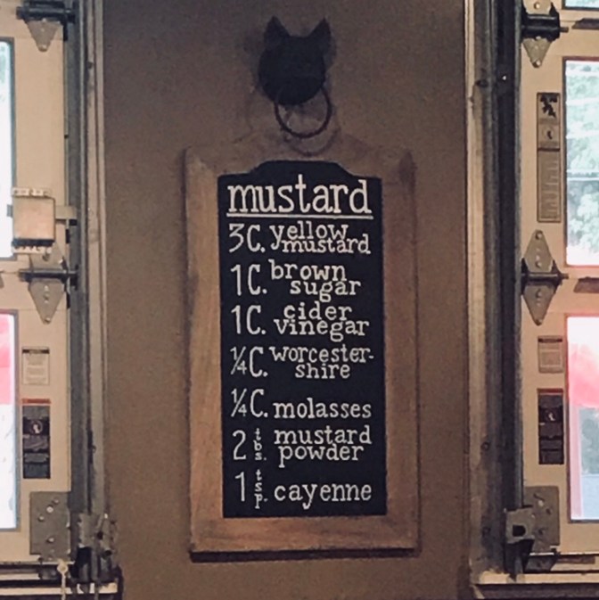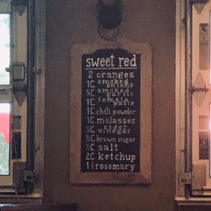 The Baked Potato Salad was awesome! (I really have to find my own recipe for that so I can make it at home.) The recipes for the bbq sauces were posted on chalkboards in the restaurant. The Sweet Red was gf, but the Mustard had Worcestershire sauce which is generally not gf, so I avoided that one.