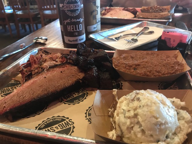 The BBQ was delish and our waitress was really great about pointing out what was safe and what to avoid. Actually there were only a few items that weren’t gf. I ordered the Three Meat Platter because I was starving and I figured that since I’d only had chips for lunch that I absolutely needed that huge plate of food. (I DID NOT!) Whew! That was a crazy amount of food. Brian and I could totally have shared that plate. It was all delicious…. I did my best…. but I ended up taking most of it back to the hotel.